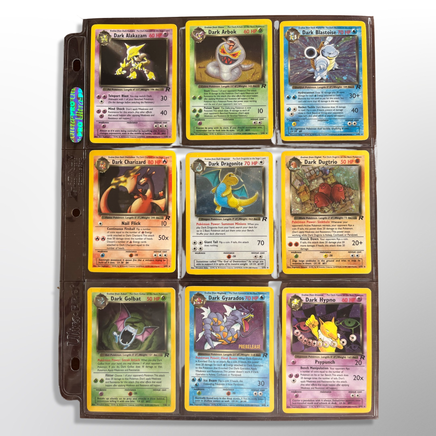 This master set includes all 83 cards from the Team Rocket Unlimited expansion, including the rare holographic Dark Charizard card, as well as the equally rare Dark Dragonite and Dark Raichu cards. The cards are kept in a high-quality binder. Each card has been carefully inspected and is guaranteed to be authentic and original (or your money back).
