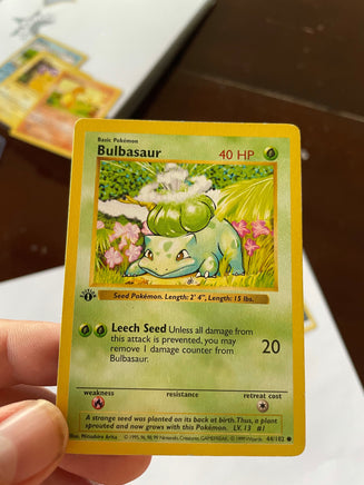 1st Edition Shadowless Base Set Starter Pokémon. Includes Base Set Bulbasaur, Charmander, Squirtle, and Yellow Cheeks Pikachu. The starter Pokemon from the very first edition of the very first Pokemon TCG set (1st Edition Shadowless Base Set 102/102).