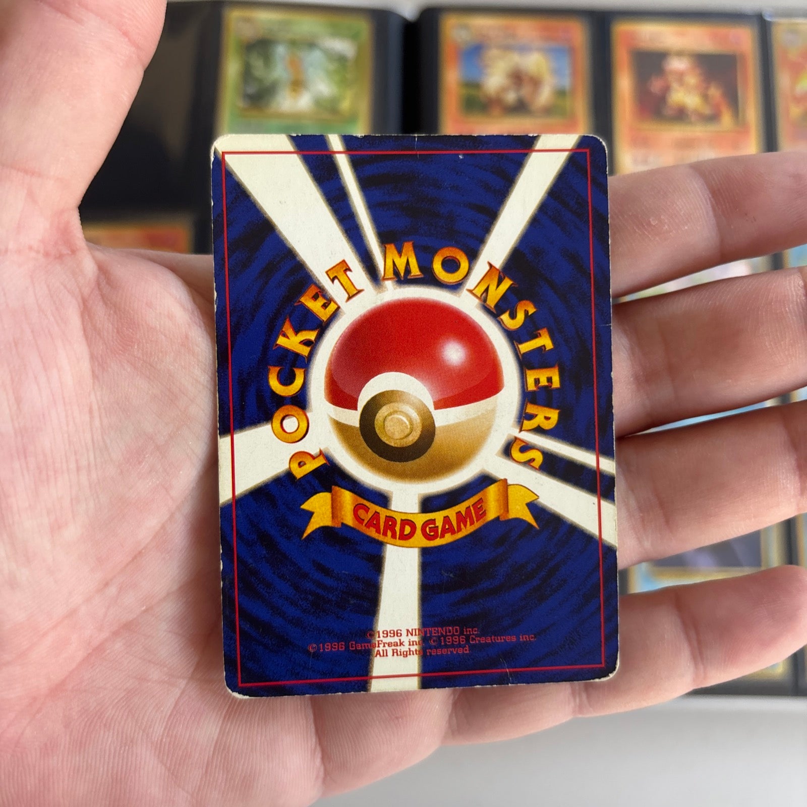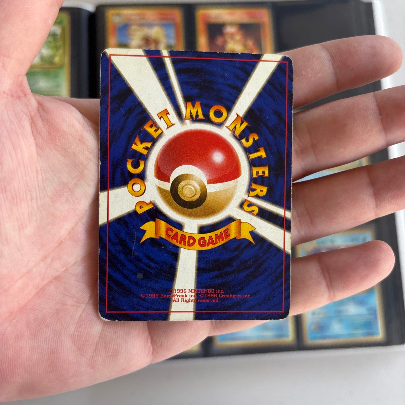 Printed by Media Factory and released in October 1996, the Expansion Pack introduced the world to Pokémon cards. Unlike later English releases, these early cards often have no rarity symbol, different attack names, and a distinct color tone that reflects the earliest print run style.
